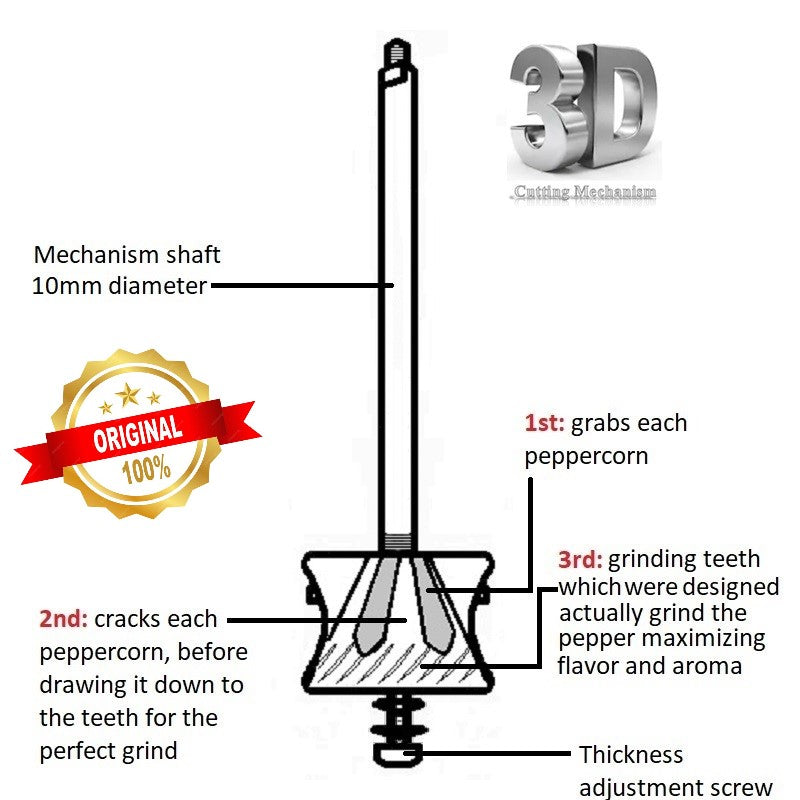 Key features of the mechanism include the 3DCut grinding system and an adjustable metal grinding mechanism that transitions from fine to coarse. The mill itself features a long handle for easy grinding, a durable polished brass body, and a solid metal chrome-plated top cap.