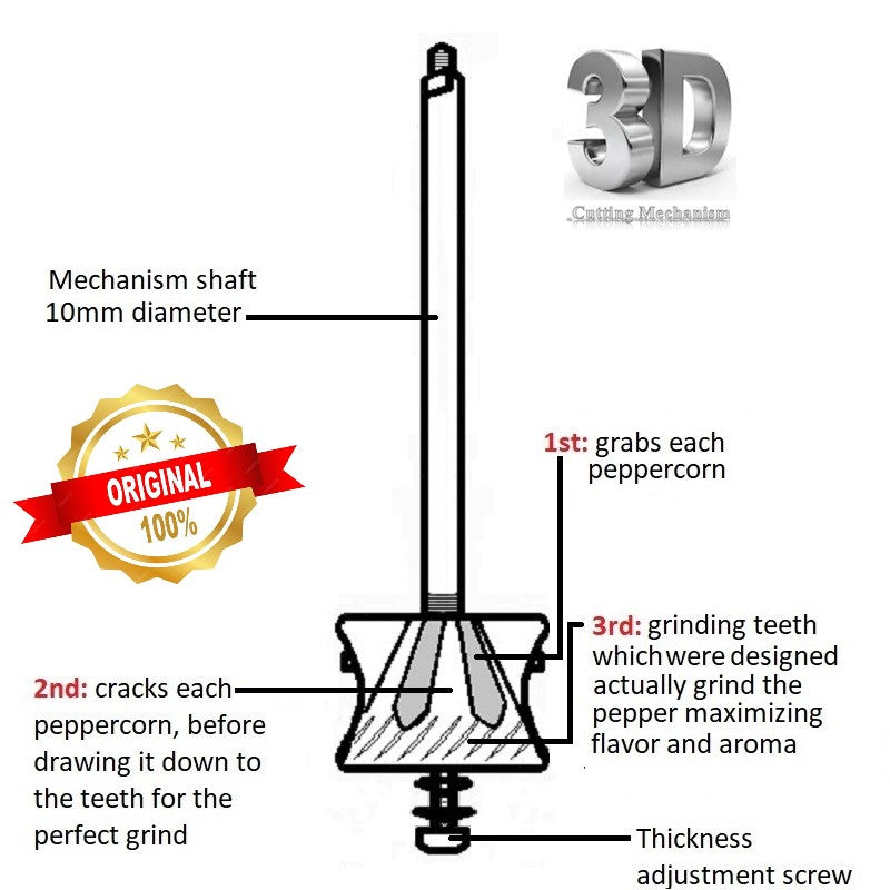 Equipped with a 100% metal mechanism, boasting a 38mm diameter and featuring an innovative 3DCut system, this mill is designed to finely grind peppercorns, unlocking their full flavor and aroma. Unlike conventional pepper mills that simply crush peppercorns, this mill ensures optimal flavor release.