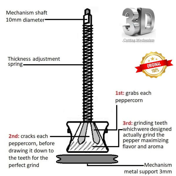 3DCut Grinding System: Efficiently grinds rather than crushes peppercorns.