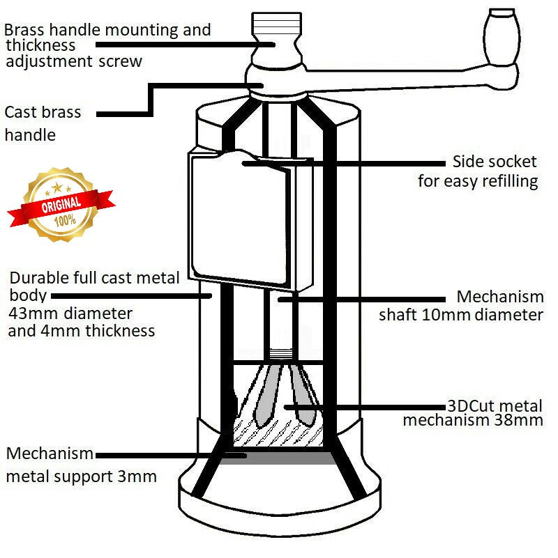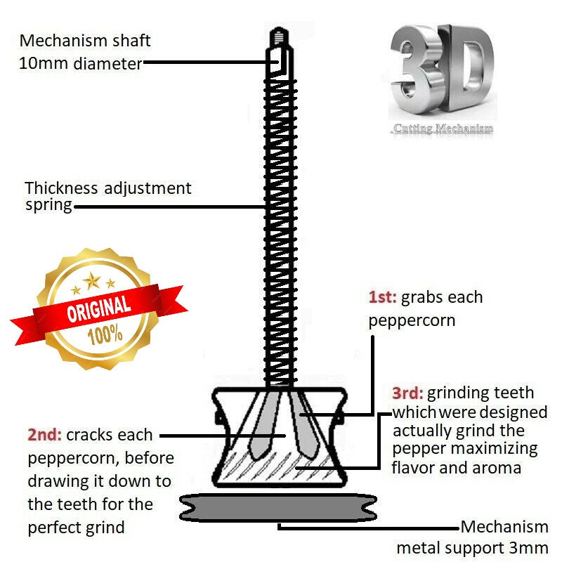 The grinding process occurs in three meticulous steps with the 3DCut system: Firstly, each peppercorn is grabbed and cracked in half, followed by cutting them into smaller pieces, and finally sending them to the small teeth for grinding to the desired thickness. Handcrafted in Greece to meet stringent standards of quality and functionality, the Alexander Mills have been a trusted choice since 1977, consistently earning praise for their durability and performance. With its robust construction and thoughtful design, this mill is an indispensable tool for every kitchen.