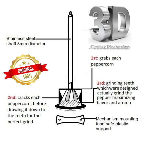 The Salt Mill Alexander #219 is crafted from chrome-plated brass with elegant brass details on the top and base. It features a robust, food-safe plastic mechanism (40% glass) with a 38mm diameter and a stainless-steel shaft to prevent corrosion. The 3DCut system is designed to grind salt thoroughly, maximizing its flavor and aroma, unlike common salt mills that only smash the salt, limiting flavor release. This mill provides ample space for your favorite salt and allows you to grind directly over food.