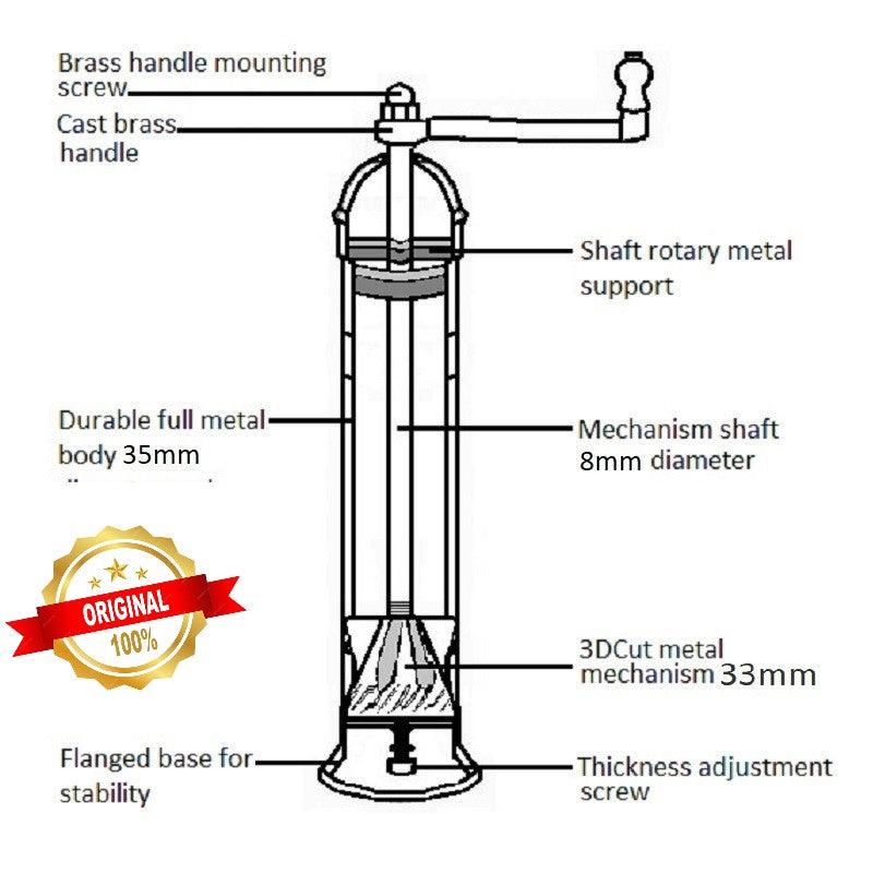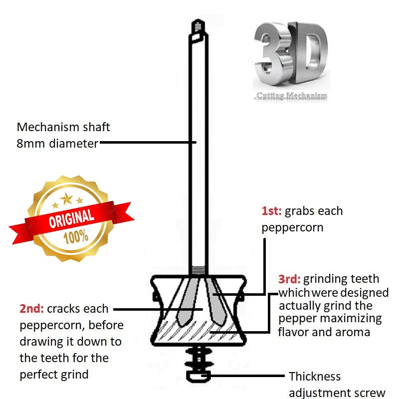 Equipped with a 100% metal mechanism, 33mm in diameter, featuring a cutting-edge 3DCut system, this mill is designed to finely grind peppercorns, unlocking their full flavor and aroma. Unlike conventional pepper mills that merely crush peppercorns, this mill ensures optimal flavor release.