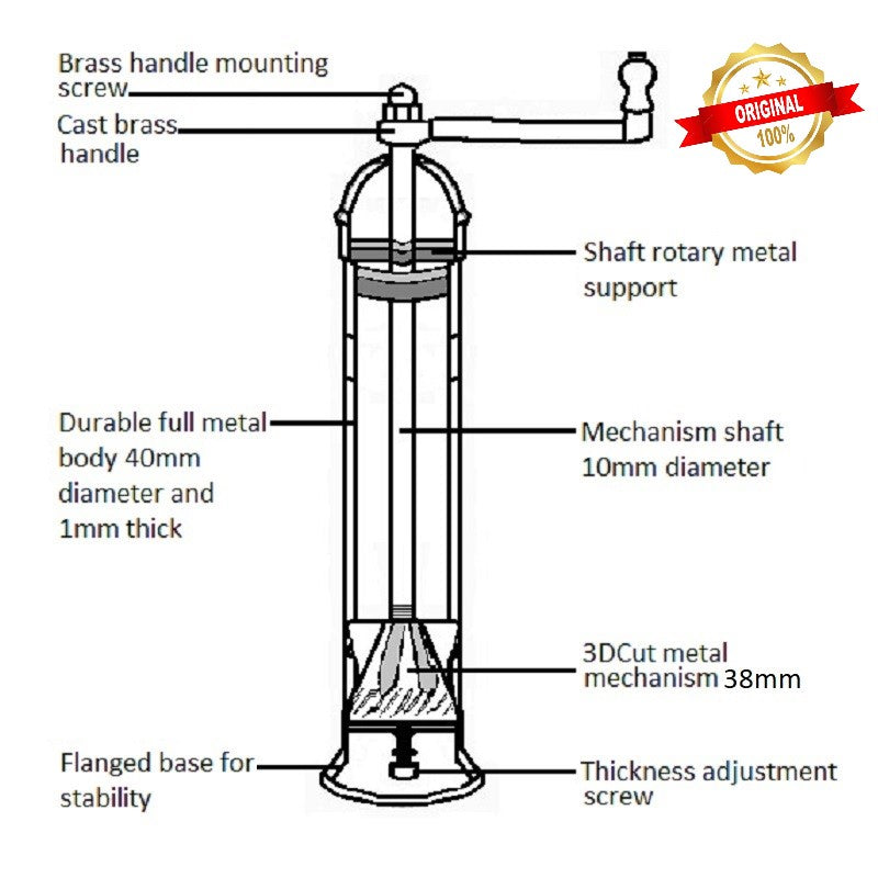 The ALEXANDER #103 Brass Pepper Mill features a 100% metal mechanism with a 38mm diameter and a 3DCut system designed to truly grind peppercorns, enhancing their flavor and aroma. Unlike common pepper mills that merely smash the peppercorns, this mill maximizes flavor release. The adjustable mechanism allows for fine to coarse grinding to match your recipe needs. Each mill offers ample space for your favorite dry seasonings and lets you grind directly over your food.