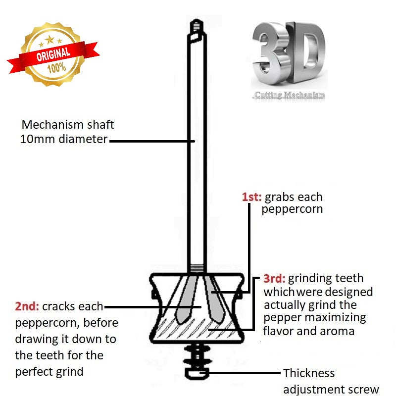 3DCut Grinding System: Precisely grinds rather than crushes peppercorns.