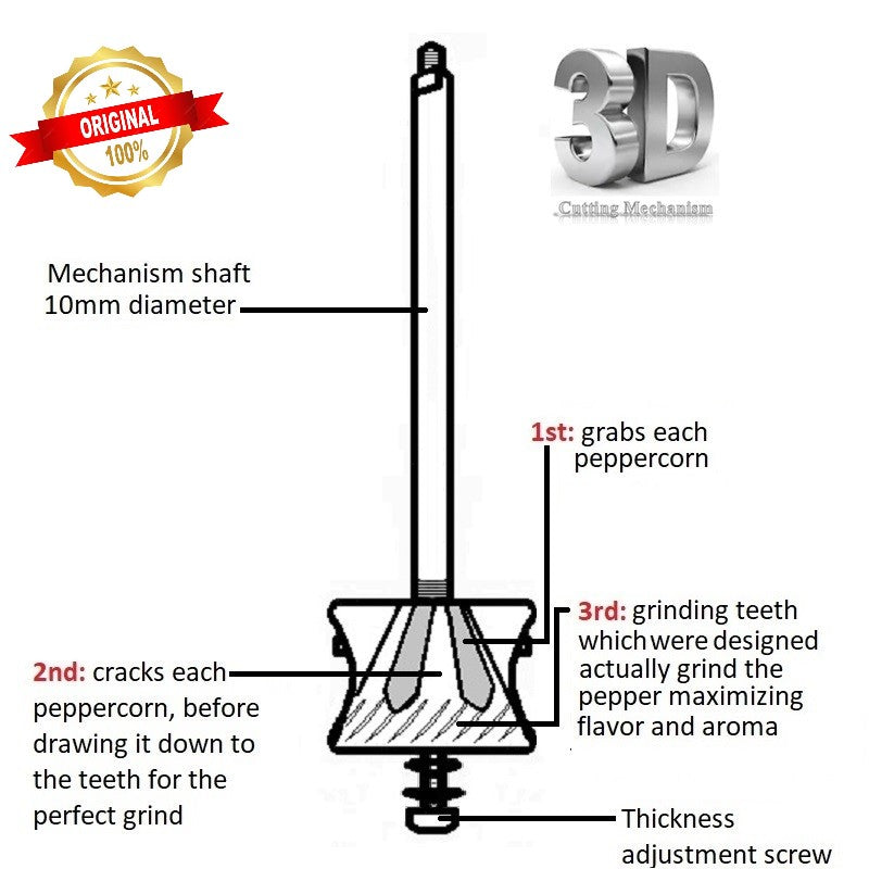 3DCut Grinding System: Designed to grind, not just crush, peppercorns.
